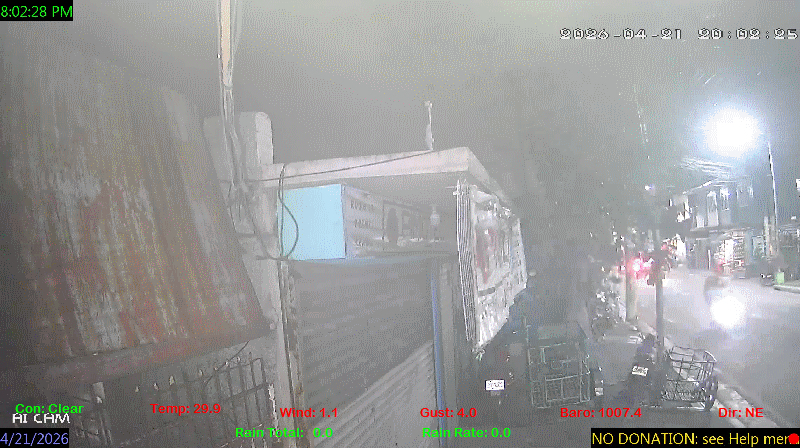 1 Rain season in the Philippines: June 1st to Oct 31st.   5 Estimated amount of water needed to replace the water used by plants and evaporation from the past week. (Negative numbers mean amount of water needed, positive numbers mean excess water is present).   6 Air Quality Index is provided by Luftdaten System esp8266 and is updated every 5 mins..   9 Solar Index represents either an absolute scale of solar energy (W/m²) using the station’s recorded maximum or a percentage of computed theoretical solar maximum using the station’s location and time of day. These indices differ most when the sun is low on the horizon. The current scale is shown, and will toggle if it or the icon is clicked.   10 Historical average only to day 21 of just the month of April for this station since 2017.   11 Historical average rain this season to day 21 of April for this station since 2017.