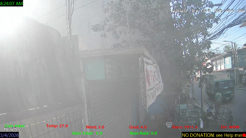 1 Rain season in the Philippines: June 1st to Oct 31st.   5 Estimated amount of water needed to replace the water used by plants and evaporation from the past week. (Negative numbers mean amount of water needed, positive numbers mean excess water is present).   6 Air Quality Index is provided by Luftdaten System esp8266 and is updated every 5 mins..   9 Solar Index represents either an absolute scale of solar energy (W/m²) using the station’s recorded maximum or a percentage of computed theoretical solar maximum using the station’s location and time of day. These indices differ most when the sun is low on the horizon. The current scale is shown, and will toggle if it or the icon is clicked.   10 Historical average only to day 3 of just the month of March for this station since 2016.   11 Historical average rain this season to day 3 of March for this station since 2016.