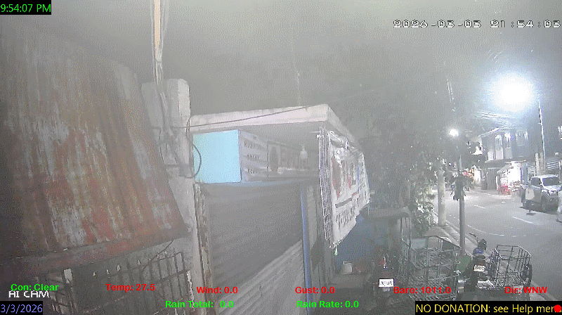 1 Rain season in the Philippines: June 1st to Oct 31st.   5 Estimated amount of water needed to replace the water used by plants and evaporation from the past week. (Negative numbers mean amount of water needed, positive numbers mean excess water is present).   6 Air Quality Index is provided by Luftdaten System esp8266 and is updated every 5 mins..   9 Solar Index represents either an absolute scale of solar energy (W/m²) using the station’s recorded maximum or a percentage of computed theoretical solar maximum using the station’s location and time of day. These indices differ most when the sun is low on the horizon. The current scale is shown, and will toggle if it or the icon is clicked.   10 Historical average only to day 3 of just the month of March for this station since 2016.   11 Historical average rain this season to day 3 of March for this station since 2016.