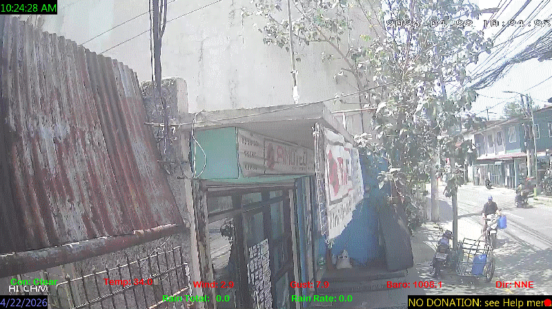 1 Rain season in the Philippines: June 1st to Oct 31st.   5 Estimated amount of water needed to replace the water used by plants and evaporation from the past week. (Negative numbers mean amount of water needed, positive numbers mean excess water is present).   6 Air Quality Index is provided by Luftdaten System esp8266 and is updated every 5 mins..   9 Solar Index represents either an absolute scale of solar energy (W/m²) using the station’s recorded maximum or a percentage of computed theoretical solar maximum using the station’s location and time of day. These indices differ most when the sun is low on the horizon. The current scale is shown, and will toggle if it or the icon is clicked.   10 Historical average only to day 22 of just the month of April for this station since 2017.   11 Historical average rain this season to day 22 of April for this station since 2017.