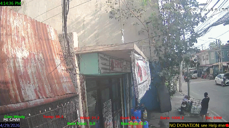 1 Rain season in the Philippines: June 1st to Oct 31st.   5 Estimated amount of water needed to replace the water used by plants and evaporation from the past week. (Negative numbers mean amount of water needed, positive numbers mean excess water is present).   6 Air Quality Index is provided by Luftdaten System esp8266 and is updated every 5 mins..   9 Solar Index represents either an absolute scale of solar energy (W/m²) using the station’s recorded maximum or a percentage of computed theoretical solar maximum using the station’s location and time of day. These indices differ most when the sun is low on the horizon. The current scale is shown, and will toggle if it or the icon is clicked.   10 Historical average only to day 29 of just the month of April for this station since 2017.   11 Historical average rain this season to day 29 of April for this station since 2017.