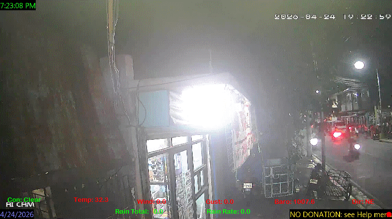 1 Rain season in the Philippines: June 1st to Oct 31st.   5 Estimated amount of water needed to replace the water used by plants and evaporation from the past week. (Negative numbers mean amount of water needed, positive numbers mean excess water is present).   6 Air Quality Index is provided by Luftdaten System esp8266 and is updated every 5 mins..   9 Solar Index represents either an absolute scale of solar energy (W/m²) using the station’s recorded maximum or a percentage of computed theoretical solar maximum using the station’s location and time of day. These indices differ most when the sun is low on the horizon. The current scale is shown, and will toggle if it or the icon is clicked.   10 Historical average only to day 24 of just the month of April for this station since 2017.   11 Historical average rain this season to day 24 of April for this station since 2017.