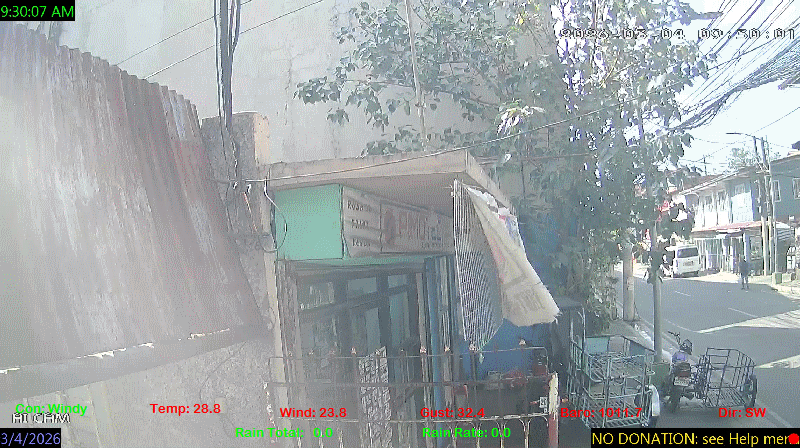 1 Rain season in the Philippines: June 1st to Oct 31st.   5 Estimated amount of water needed to replace the water used by plants and evaporation from the past week. (Negative numbers mean amount of water needed, positive numbers mean excess water is present).   6 Air Quality Index is provided by Luftdaten System esp8266 and is updated every 5 mins..   10 Historical average only to day 4 of just the month of March for this station since 2016.   11 Historical average rain this season to day 4 of March for this station since 2016.