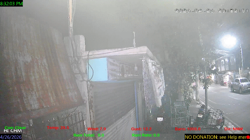 1 Rain season in the Philippines: June 1st to Oct 31st.   5 Estimated amount of water needed to replace the water used by plants and evaporation from the past week. (Negative numbers mean amount of water needed, positive numbers mean excess water is present).   6 Air Quality Index is provided by Luftdaten System esp8266 and is updated every 5 mins..   9 Solar Index represents either an absolute scale of solar energy (W/m²) using the station’s recorded maximum or a percentage of computed theoretical solar maximum using the station’s location and time of day. These indices differ most when the sun is low on the horizon. The current scale is shown, and will toggle if it or the icon is clicked.   10 Historical average only to day 24 of just the month of April for this station since 2017.   11 Historical average rain this season to day 24 of April for this station since 2017.