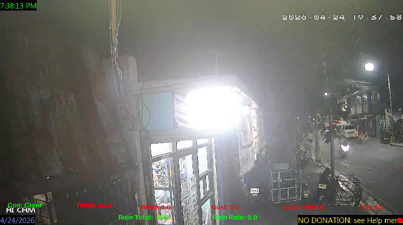 1 Rain season in the Philippines: June 1st to Oct 31st.   5 Estimated amount of water needed to replace the water used by plants and evaporation from the past week. (Negative numbers mean amount of water needed, positive numbers mean excess water is present).   6 Air Quality Index is provided by Luftdaten System esp8266 and is updated every 5 mins..   9 Solar Index represents either an absolute scale of solar energy (W/m²) using the station’s recorded maximum or a percentage of computed theoretical solar maximum using the station’s location and time of day. These indices differ most when the sun is low on the horizon. The current scale is shown, and will toggle if it or the icon is clicked.   10 Historical average only to day 24 of just the month of April for this station since 2017.   11 Historical average rain this season to day 24 of April for this station since 2017.