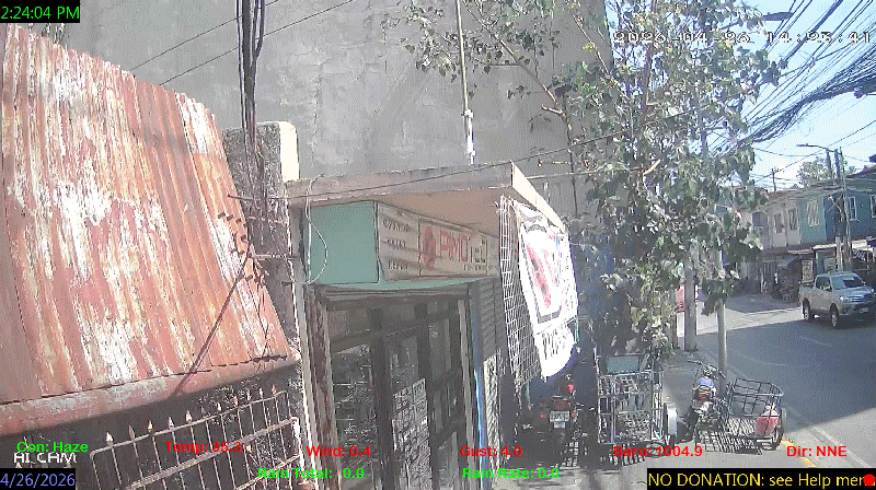 1 Rain season in the Philippines: June 1st to Oct 31st.   5 Estimated amount of water needed to replace the water used by plants and evaporation from the past week. (Negative numbers mean amount of water needed, positive numbers mean excess water is present).   6 Air Quality Index is provided by Luftdaten System esp8266 and is updated every 5 mins..   9 Solar Index represents either an absolute scale of solar energy (W/m²) using the station’s recorded maximum or a percentage of computed theoretical solar maximum using the station’s location and time of day. These indices differ most when the sun is low on the horizon. The current scale is shown, and will toggle if it or the icon is clicked.   10 Historical average only to day 26 of just the month of April for this station since 2017.   11 Historical average rain this season to day 26 of April for this station since 2017.