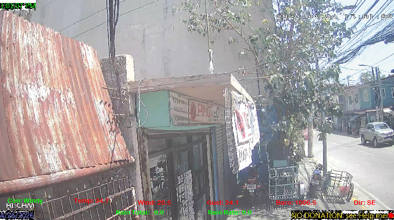 1 Rain season in the Philippines: June 1st to Oct 31st.   5 Estimated amount of water needed to replace the water used by plants and evaporation from the past week. (Negative numbers mean amount of water needed, positive numbers mean excess water is present).   6 Air Quality Index is provided by Luftdaten System esp8266 and is updated every 5 mins..   9 Solar Index represents either an absolute scale of solar energy (W/m²) using the station’s recorded maximum or a percentage of computed theoretical solar maximum using the station’s location and time of day. These indices differ most when the sun is low on the horizon. The current scale is shown, and will toggle if it or the icon is clicked.   10 Historical average only to day 26 of just the month of April for this station since 2017.   11 Historical average rain this season to day 26 of April for this station since 2017.