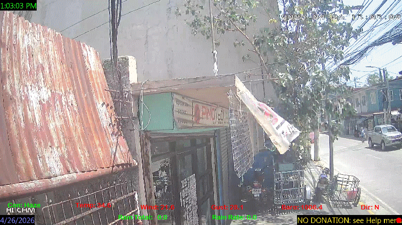 1 Rain season in the Philippines: June 1st to Oct 31st.   5 Estimated amount of water needed to replace the water used by plants and evaporation from the past week. (Negative numbers mean amount of water needed, positive numbers mean excess water is present).   6 Air Quality Index is provided by Luftdaten System esp8266 and is updated every 5 mins..   9 Solar Index represents either an absolute scale of solar energy (W/m²) using the station’s recorded maximum or a percentage of computed theoretical solar maximum using the station’s location and time of day. These indices differ most when the sun is low on the horizon. The current scale is shown, and will toggle if it or the icon is clicked.   10 Historical average only to day 26 of just the month of April for this station since 2017.   11 Historical average rain this season to day 26 of April for this station since 2017.