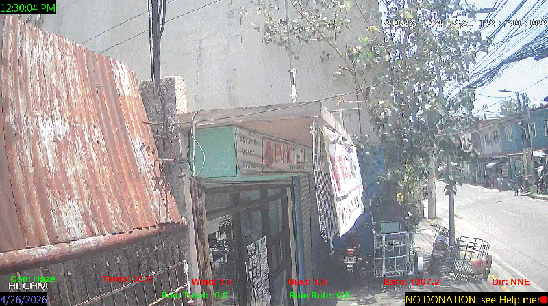 1 Rain season in the Philippines: June 1st to Oct 31st.   5 Estimated amount of water needed to replace the water used by plants and evaporation from the past week. (Negative numbers mean amount of water needed, positive numbers mean excess water is present).   6 Air Quality Index is provided by Luftdaten System esp8266 and is updated every 5 mins..   9 Solar Index represents either an absolute scale of solar energy (W/m²) using the station’s recorded maximum or a percentage of computed theoretical solar maximum using the station’s location and time of day. These indices differ most when the sun is low on the horizon. The current scale is shown, and will toggle if it or the icon is clicked.   10 Historical average only to day 26 of just the month of April for this station since 2017.   11 Historical average rain this season to day 26 of April for this station since 2017.