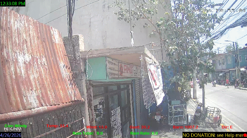 1 Rain season in the Philippines: June 1st to Oct 31st.   5 Estimated amount of water needed to replace the water used by plants and evaporation from the past week. (Negative numbers mean amount of water needed, positive numbers mean excess water is present).   6 Air Quality Index is provided by Luftdaten System esp8266 and is updated every 5 mins..   9 Solar Index represents either an absolute scale of solar energy (W/m²) using the station’s recorded maximum or a percentage of computed theoretical solar maximum using the station’s location and time of day. These indices differ most when the sun is low on the horizon. The current scale is shown, and will toggle if it or the icon is clicked.   10 Historical average only to day 26 of just the month of April for this station since 2017.   11 Historical average rain this season to day 26 of April for this station since 2017.