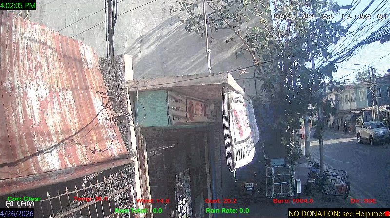1 Rain season in the Philippines: June 1st to Oct 31st.   5 Estimated amount of water needed to replace the water used by plants and evaporation from the past week. (Negative numbers mean amount of water needed, positive numbers mean excess water is present).   6 Air Quality Index is provided by Luftdaten System esp8266 and is updated every 5 mins..   9 Solar Index represents either an absolute scale of solar energy (W/m²) using the station’s recorded maximum or a percentage of computed theoretical solar maximum using the station’s location and time of day. These indices differ most when the sun is low on the horizon. The current scale is shown, and will toggle if it or the icon is clicked.   10 Historical average only to day 26 of just the month of April for this station since 2017.   11 Historical average rain this season to day 26 of April for this station since 2017.