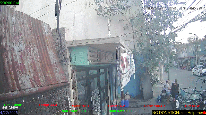 1 Rain season in the Philippines: June 1st to Oct 31st.   5 Estimated amount of water needed to replace the water used by plants and evaporation from the past week. (Negative numbers mean amount of water needed, positive numbers mean excess water is present).   6 Air Quality Index is provided by Luftdaten System esp8266 and is updated every 5 mins..   9 Solar Index represents either an absolute scale of solar energy (W/m²) using the station’s recorded maximum or a percentage of computed theoretical solar maximum using the station’s location and time of day. These indices differ most when the sun is low on the horizon. The current scale is shown, and will toggle if it or the icon is clicked.   10 Historical average only to day 22 of just the month of April for this station since 2017.   11 Historical average rain this season to day 22 of April for this station since 2017.