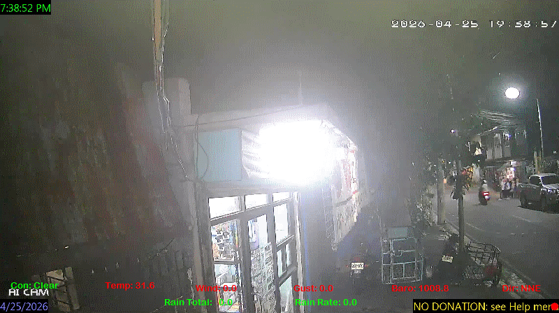 1 Rain season in the Philippines: June 1st to Oct 31st.   5 Estimated amount of water needed to replace the water used by plants and evaporation from the past week. (Negative numbers mean amount of water needed, positive numbers mean excess water is present).   6 Air Quality Index is provided by Luftdaten System esp8266 and is updated every 5 mins..   9 Solar Index represents either an absolute scale of solar energy (W/m²) using the station’s recorded maximum or a percentage of computed theoretical solar maximum using the station’s location and time of day. These indices differ most when the sun is low on the horizon. The current scale is shown, and will toggle if it or the icon is clicked.   10 Historical average only to day 25 of just the month of April for this station since 2017.   11 Historical average rain this season to day 25 of April for this station since 2017.