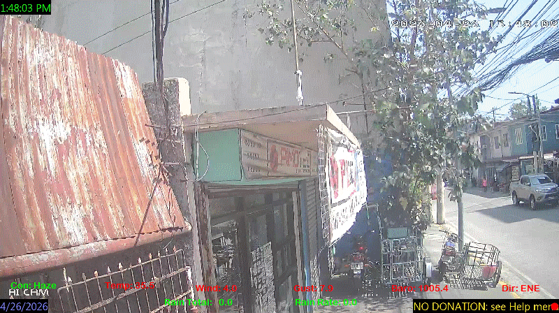1 Rain season in the Philippines: June 1st to Oct 31st.   5 Estimated amount of water needed to replace the water used by plants and evaporation from the past week. (Negative numbers mean amount of water needed, positive numbers mean excess water is present).   6 Air Quality Index is provided by Luftdaten System esp8266 and is updated every 5 mins..   9 Solar Index represents either an absolute scale of solar energy (W/m²) using the station’s recorded maximum or a percentage of computed theoretical solar maximum using the station’s location and time of day. These indices differ most when the sun is low on the horizon. The current scale is shown, and will toggle if it or the icon is clicked.   10 Historical average only to day 26 of just the month of April for this station since 2017.   11 Historical average rain this season to day 26 of April for this station since 2017.