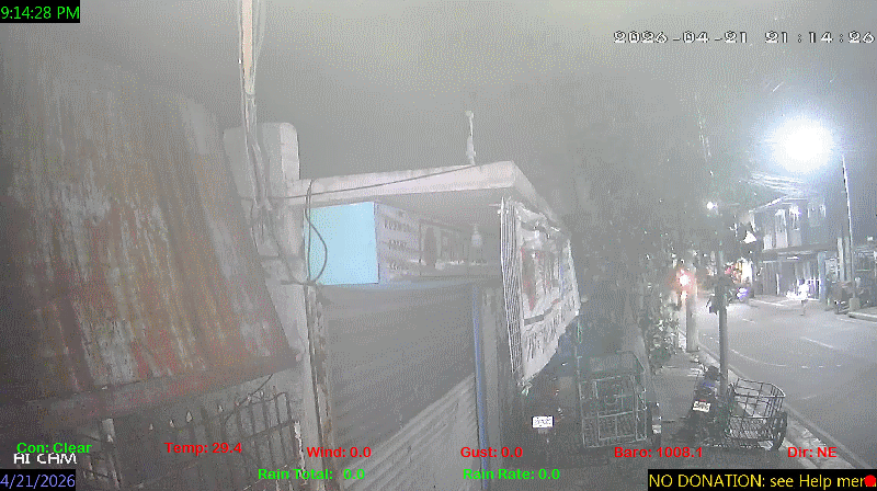 1 Rain season in the Philippines: June 1st to Oct 31st.   5 Estimated amount of water needed to replace the water used by plants and evaporation from the past week. (Negative numbers mean amount of water needed, positive numbers mean excess water is present).   6 Air Quality Index is provided by Luftdaten System esp8266 and is updated every 5 mins..   9 Solar Index represents either an absolute scale of solar energy (W/m²) using the station’s recorded maximum or a percentage of computed theoretical solar maximum using the station’s location and time of day. These indices differ most when the sun is low on the horizon. The current scale is shown, and will toggle if it or the icon is clicked.   10 Historical average only to day 21 of just the month of April for this station since 2017.   11 Historical average rain this season to day 21 of April for this station since 2017.