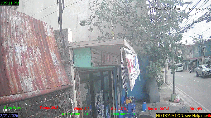 1 Rain season in the Philippines: June 1st to Oct 31st.   5 Estimated amount of water needed to replace the water used by plants and evaporation from the past week. (Negative numbers mean amount of water needed, positive numbers mean excess water is present).   6 Air Quality Index is provided by Luftdaten System esp8266 and is updated every 5 mins..   9 Solar Index represents either an absolute scale of solar energy (W/m²) using the station’s recorded maximum or a percentage of computed theoretical solar maximum using the station’s location and time of day. These indices differ most when the sun is low on the horizon. The current scale is shown, and will toggle if it or the icon is clicked.   10 Historical average only to day 21 of just the month of February for this station since 2016.   11 Historical average rain this season to day 21 of February for this station since 2016.