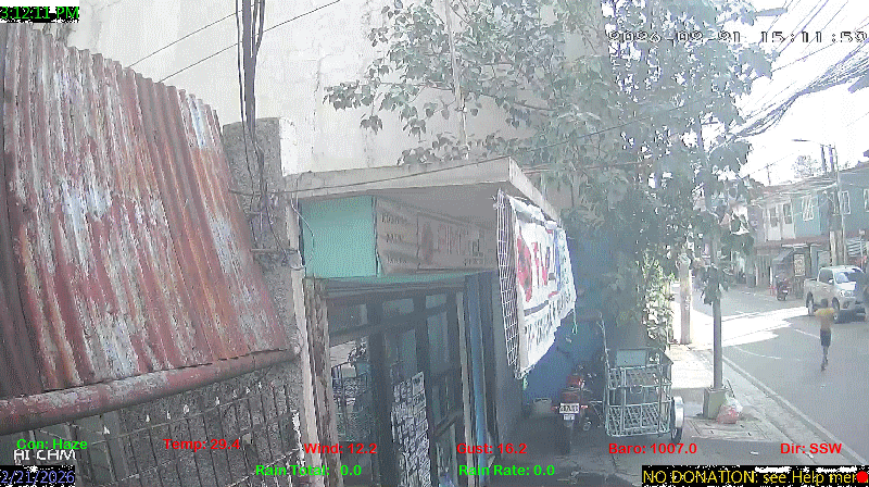 1 Rain season in the Philippines: June 1st to Oct 31st.   5 Estimated amount of water needed to replace the water used by plants and evaporation from the past week. (Negative numbers mean amount of water needed, positive numbers mean excess water is present).   6 Air Quality Index is provided by Luftdaten System esp8266 and is updated every 5 mins..   9 Solar Index represents either an absolute scale of solar energy (W/m²) using the station’s recorded maximum or a percentage of computed theoretical solar maximum using the station’s location and time of day. These indices differ most when the sun is low on the horizon. The current scale is shown, and will toggle if it or the icon is clicked.   10 Historical average only to day 21 of just the month of February for this station since 2016.   11 Historical average rain this season to day 21 of February for this station since 2016.