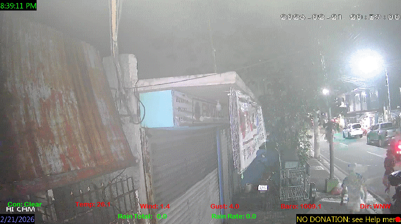 1 Rain season in the Philippines: June 1st to Oct 31st.   5 Estimated amount of water needed to replace the water used by plants and evaporation from the past week. (Negative numbers mean amount of water needed, positive numbers mean excess water is present).   6 Air Quality Index is provided by Luftdaten System esp8266 and is updated every 5 mins..   9 Solar Index represents either an absolute scale of solar energy (W/m²) using the station’s recorded maximum or a percentage of computed theoretical solar maximum using the station’s location and time of day. These indices differ most when the sun is low on the horizon. The current scale is shown, and will toggle if it or the icon is clicked.   10 Historical average only to day 21 of just the month of February for this station since 2016.   11 Historical average rain this season to day 21 of February for this station since 2016.