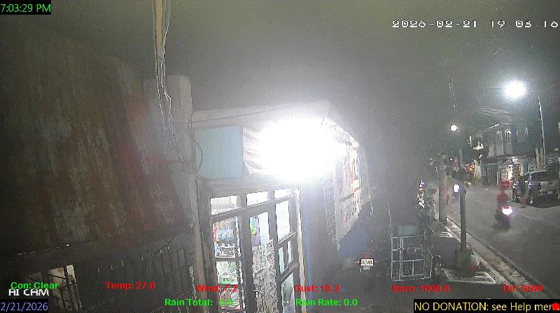 1 Rain season in the Philippines: June 1st to Oct 31st.   5 Estimated amount of water needed to replace the water used by plants and evaporation from the past week. (Negative numbers mean amount of water needed, positive numbers mean excess water is present).   6 Air Quality Index is provided by Luftdaten System esp8266 and is updated every 5 mins..   9 Solar Index represents either an absolute scale of solar energy (W/m²) using the station’s recorded maximum or a percentage of computed theoretical solar maximum using the station’s location and time of day. These indices differ most when the sun is low on the horizon. The current scale is shown, and will toggle if it or the icon is clicked.   10 Historical average only to day 21 of just the month of February for this station since 2016.   11 Historical average rain this season to day 21 of February for this station since 2016.