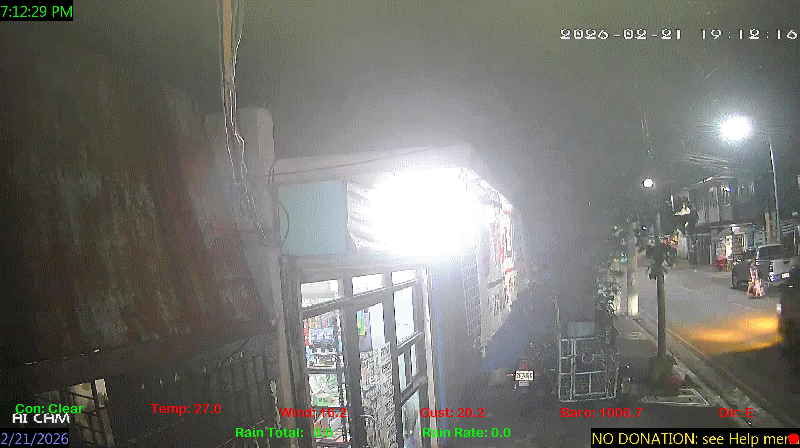 1 Rain season in the Philippines: June 1st to Oct 31st.   5 Estimated amount of water needed to replace the water used by plants and evaporation from the past week. (Negative numbers mean amount of water needed, positive numbers mean excess water is present).   6 Air Quality Index is provided by Luftdaten System esp8266 and is updated every 5 mins..   9 Solar Index represents either an absolute scale of solar energy (W/m²) using the station’s recorded maximum or a percentage of computed theoretical solar maximum using the station’s location and time of day. These indices differ most when the sun is low on the horizon. The current scale is shown, and will toggle if it or the icon is clicked.   10 Historical average only to day 21 of just the month of February for this station since 2016.   11 Historical average rain this season to day 21 of February for this station since 2016.