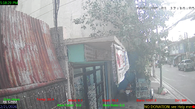 1 Rain season in the Philippines: June 1st to Oct 31st.   5 Estimated amount of water needed to replace the water used by plants and evaporation from the past week. (Negative numbers mean amount of water needed, positive numbers mean excess water is present).   6 Air Quality Index is provided by Luftdaten System esp8266 and is updated every 5 mins..   9 Solar Index represents either an absolute scale of solar energy (W/m²) using the station’s recorded maximum or a percentage of computed theoretical solar maximum using the station’s location and time of day. These indices differ most when the sun is low on the horizon. The current scale is shown, and will toggle if it or the icon is clicked.   10 Historical average only to day 21 of just the month of February for this station since 2016.   11 Historical average rain this season to day 21 of February for this station since 2016.
