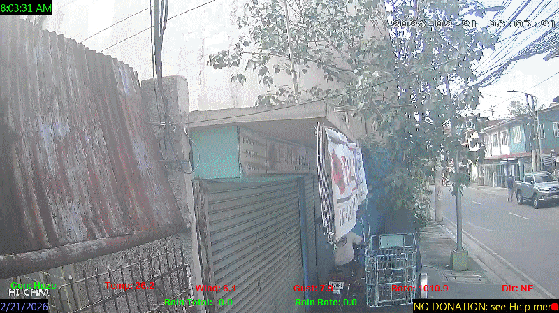 1 Rain season in the Philippines: June 1st to Oct 31st.   5 Estimated amount of water needed to replace the water used by plants and evaporation from the past week. (Negative numbers mean amount of water needed, positive numbers mean excess water is present).   6 Air Quality Index is provided by Luftdaten System esp8266 and is updated every 5 mins..   10 Historical average only to day 21 of just the month of February for this station since 2016.   11 Historical average rain this season to day 21 of February for this station since 2016.