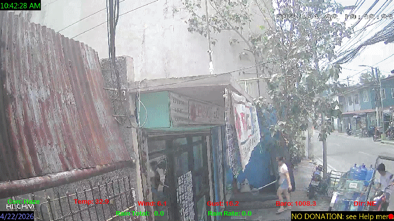 1 Rain season in the Philippines: June 1st to Oct 31st.   5 Estimated amount of water needed to replace the water used by plants and evaporation from the past week. (Negative numbers mean amount of water needed, positive numbers mean excess water is present).   6 Air Quality Index is provided by Luftdaten System esp8266 and is updated every 5 mins..   9 Solar Index represents either an absolute scale of solar energy (W/m²) using the station’s recorded maximum or a percentage of computed theoretical solar maximum using the station’s location and time of day. These indices differ most when the sun is low on the horizon. The current scale is shown, and will toggle if it or the icon is clicked.   10 Historical average only to day 22 of just the month of April for this station since 2017.   11 Historical average rain this season to day 22 of April for this station since 2017.