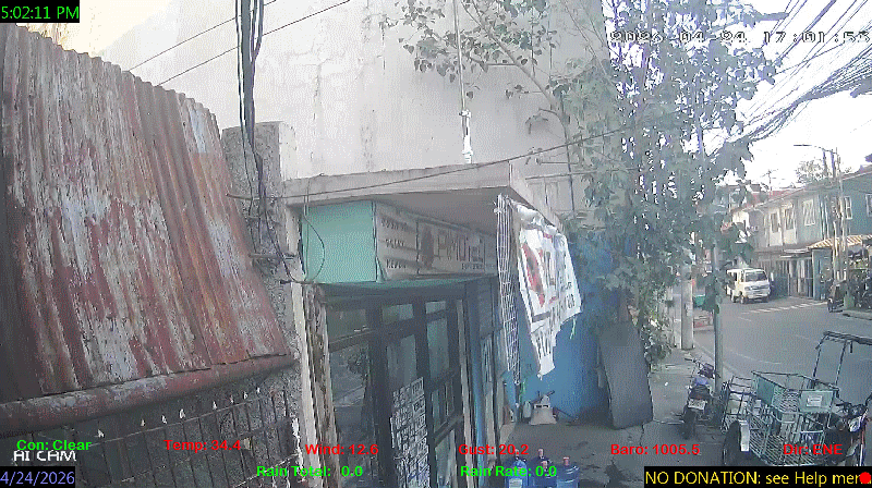 1 Rain season in the Philippines: June 1st to Oct 31st.   5 Estimated amount of water needed to replace the water used by plants and evaporation from the past week. (Negative numbers mean amount of water needed, positive numbers mean excess water is present).   6 Air Quality Index is provided by Luftdaten System esp8266 and is updated every 5 mins..   9 Solar Index represents either an absolute scale of solar energy (W/m²) using the station’s recorded maximum or a percentage of computed theoretical solar maximum using the station’s location and time of day. These indices differ most when the sun is low on the horizon. The current scale is shown, and will toggle if it or the icon is clicked.   10 Historical average only to day 22 of just the month of April for this station since 2017.   11 Historical average rain this season to day 22 of April for this station since 2017.