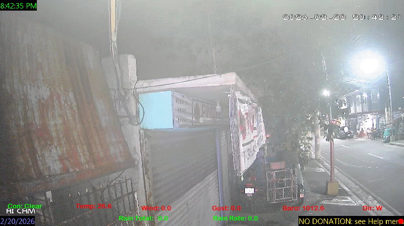 1 Rain season in the Philippines: June 1st to Oct 31st.   5 Estimated amount of water needed to replace the water used by plants and evaporation from the past week. (Negative numbers mean amount of water needed, positive numbers mean excess water is present).   6 Air Quality Index is provided by Luftdaten System esp8266 and is updated every 5 mins..   9 Solar Index represents either an absolute scale of solar energy (W/m²) using the station’s recorded maximum or a percentage of computed theoretical solar maximum using the station’s location and time of day. These indices differ most when the sun is low on the horizon. The current scale is shown, and will toggle if it or the icon is clicked.   10 Historical average only to day 20 of just the month of February for this station since 2016.   11 Historical average rain this season to day 20 of February for this station since 2016.