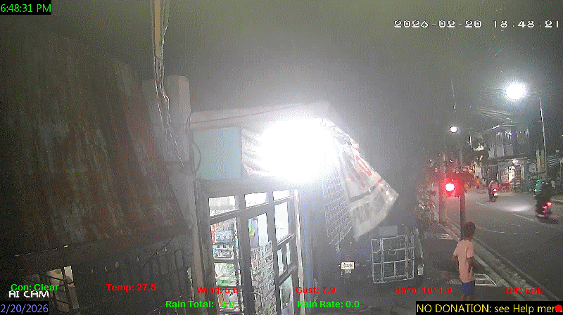 1 Rain season in the Philippines: June 1st to Oct 31st.   5 Estimated amount of water needed to replace the water used by plants and evaporation from the past week. (Negative numbers mean amount of water needed, positive numbers mean excess water is present).   6 Air Quality Index is provided by Luftdaten System esp8266 and is updated every 5 mins..   9 Solar Index represents either an absolute scale of solar energy (W/m²) using the station’s recorded maximum or a percentage of computed theoretical solar maximum using the station’s location and time of day. These indices differ most when the sun is low on the horizon. The current scale is shown, and will toggle if it or the icon is clicked.   10 Historical average only to day 20 of just the month of February for this station since 2016.   11 Historical average rain this season to day 20 of February for this station since 2016.