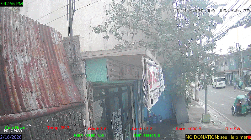 1 Rain season in the Philippines: June 1st to Oct 31st.   5 Estimated amount of water needed to replace the water used by plants and evaporation from the past week. (Negative numbers mean amount of water needed, positive numbers mean excess water is present).   6 Air Quality Index is provided by Luftdaten System esp8266 and is updated every 5 mins..   9 Solar Index represents either an absolute scale of solar energy (W/m²) using the station’s recorded maximum or a percentage of computed theoretical solar maximum using the station’s location and time of day. These indices differ most when the sun is low on the horizon. The current scale is shown, and will toggle if it or the icon is clicked.   10 Historical average only to day 16 of just the month of February for this station since 2016.   11 Historical average rain this season to day 16 of February for this station since 2016.