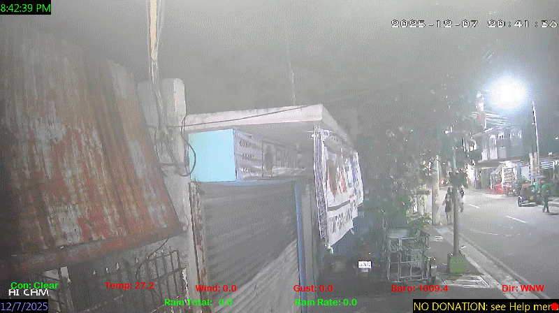 1 Rain season in the Philippines: June 1st to Oct 31st.   5 Estimated amount of water needed to replace the water used by plants and evaporation from the past week. (Negative numbers mean amount of water needed, positive numbers mean excess water is present).   6 Air Quality Index is provided by Luftdaten System esp8266 and is updated every 5 mins..   9 Solar Index represents either an absolute scale of solar energy (W/m²) using the station’s recorded maximum or a percentage of computed theoretical solar maximum using the station’s location and time of day. These indices differ most when the sun is low on the horizon. The current scale is shown, and will toggle if it or the icon is clicked.   10 Historical average only to day 7 of just the month of December for this station since 2016.   11 Historical average rain this season to day 7 of December for this station since 2016.