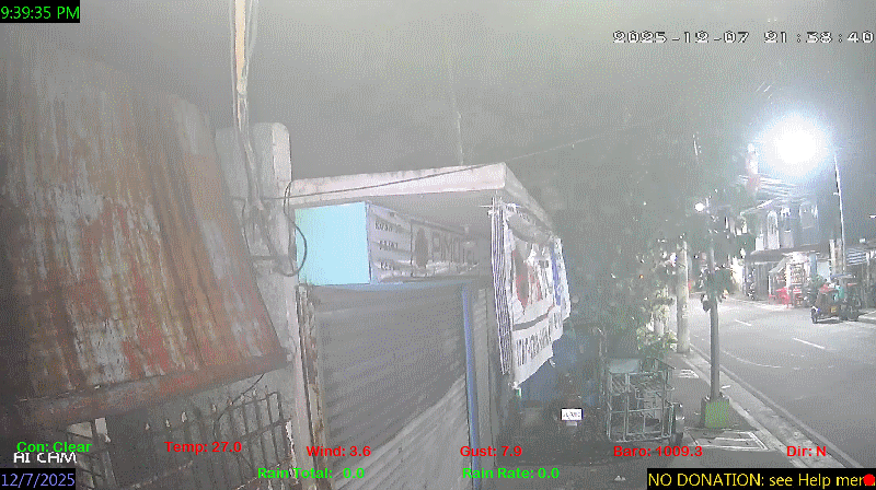 1 Rain season in the Philippines: June 1st to Oct 31st.   5 Estimated amount of water needed to replace the water used by plants and evaporation from the past week. (Negative numbers mean amount of water needed, positive numbers mean excess water is present).   6 Air Quality Index is provided by Luftdaten System esp8266 and is updated every 5 mins..   9 Solar Index represents either an absolute scale of solar energy (W/m²) using the station’s recorded maximum or a percentage of computed theoretical solar maximum using the station’s location and time of day. These indices differ most when the sun is low on the horizon. The current scale is shown, and will toggle if it or the icon is clicked.   10 Historical average only to day 7 of just the month of December for this station since 2016.   11 Historical average rain this season to day 7 of December for this station since 2016.