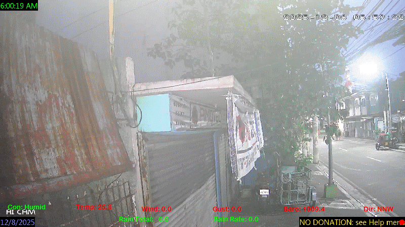 1 Rain season in the Philippines: June 1st to Oct 31st.   5 Estimated amount of water needed to replace the water used by plants and evaporation from the past week. (Negative numbers mean amount of water needed, positive numbers mean excess water is present).   6 Air Quality Index is provided by Luftdaten System esp8266 and is updated every 5 mins..   10 Historical average only to day 7 of just the month of December for this station since 2016.   11 Historical average rain this season to day 7 of December for this station since 2016.