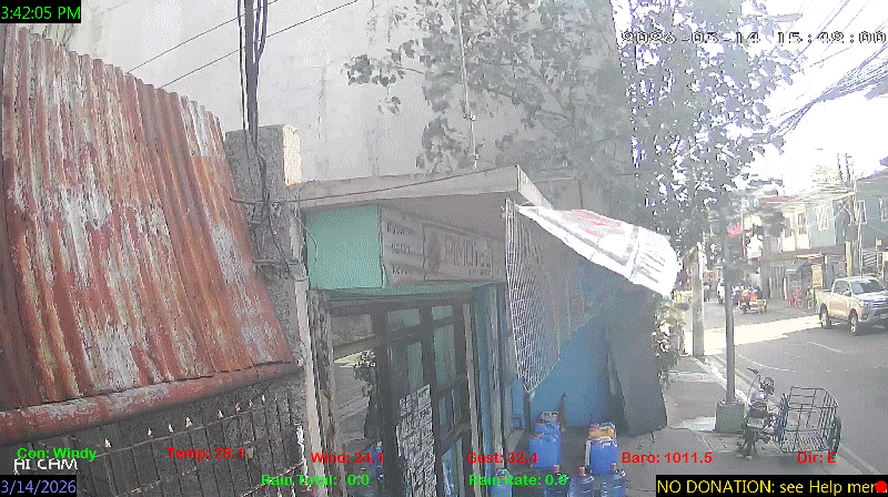 1 Rain season in the Philippines: June 1st to Oct 31st.   5 Estimated amount of water needed to replace the water used by plants and evaporation from the past week. (Negative numbers mean amount of water needed, positive numbers mean excess water is present).   6 Air Quality Index is provided by Luftdaten System esp8266 and is updated every 5 mins..   9 Solar Index represents either an absolute scale of solar energy (W/m²) using the station’s recorded maximum or a percentage of computed theoretical solar maximum using the station’s location and time of day. These indices differ most when the sun is low on the horizon. The current scale is shown, and will toggle if it or the icon is clicked.   10 Historical average only to day 14 of just the month of March for this station since 2016.   11 Historical average rain this season to day 14 of March for this station since 2016.