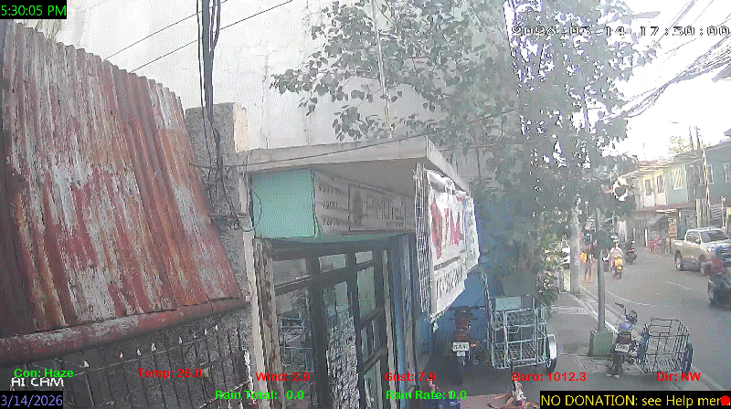 1 Rain season in the Philippines: June 1st to Oct 31st.   5 Estimated amount of water needed to replace the water used by plants and evaporation from the past week. (Negative numbers mean amount of water needed, positive numbers mean excess water is present).   6 Air Quality Index is provided by Luftdaten System esp8266 and is updated every 5 mins..   9 Solar Index represents either an absolute scale of solar energy (W/m²) using the station’s recorded maximum or a percentage of computed theoretical solar maximum using the station’s location and time of day. These indices differ most when the sun is low on the horizon. The current scale is shown, and will toggle if it or the icon is clicked.   10 Historical average only to day 14 of just the month of March for this station since 2016.   11 Historical average rain this season to day 14 of March for this station since 2016.