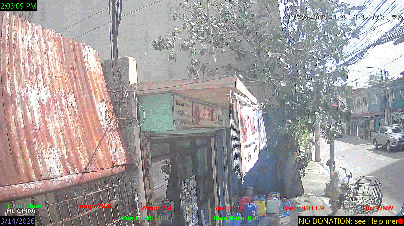 1 Rain season in the Philippines: June 1st to Oct 31st.   5 Estimated amount of water needed to replace the water used by plants and evaporation from the past week. (Negative numbers mean amount of water needed, positive numbers mean excess water is present).   6 Air Quality Index is provided by Luftdaten System esp8266 and is updated every 5 mins..   9 Solar Index represents either an absolute scale of solar energy (W/m²) using the station’s recorded maximum or a percentage of computed theoretical solar maximum using the station’s location and time of day. These indices differ most when the sun is low on the horizon. The current scale is shown, and will toggle if it or the icon is clicked.   10 Historical average only to day 14 of just the month of March for this station since 2016.   11 Historical average rain this season to day 14 of March for this station since 2016.