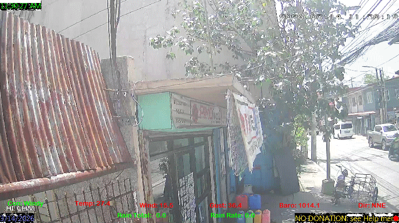 1 Rain season in the Philippines: June 1st to Oct 31st.   5 Estimated amount of water needed to replace the water used by plants and evaporation from the past week. (Negative numbers mean amount of water needed, positive numbers mean excess water is present).   6 Air Quality Index is provided by Luftdaten System esp8266 and is updated every 5 mins..   9 Solar Index represents either an absolute scale of solar energy (W/m²) using the station’s recorded maximum or a percentage of computed theoretical solar maximum using the station’s location and time of day. These indices differ most when the sun is low on the horizon. The current scale is shown, and will toggle if it or the icon is clicked.   10 Historical average only to day 14 of just the month of March for this station since 2016.   11 Historical average rain this season to day 14 of March for this station since 2016.