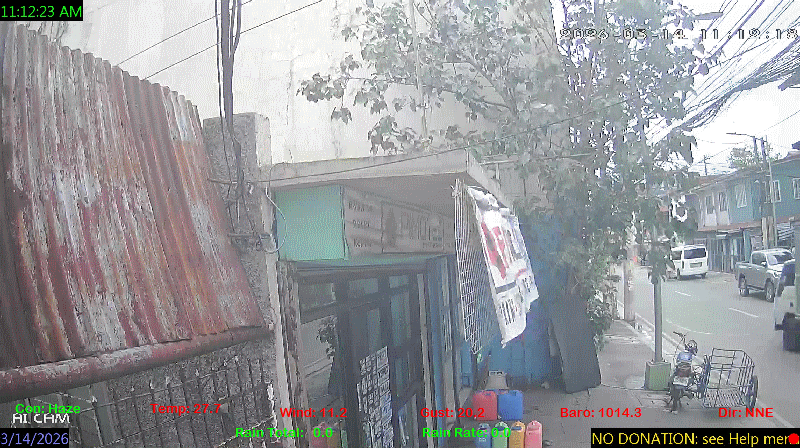 1 Rain season in the Philippines: June 1st to Oct 31st.   5 Estimated amount of water needed to replace the water used by plants and evaporation from the past week. (Negative numbers mean amount of water needed, positive numbers mean excess water is present).   6 Air Quality Index is provided by Luftdaten System esp8266 and is updated every 5 mins..   9 Solar Index represents either an absolute scale of solar energy (W/m²) using the station’s recorded maximum or a percentage of computed theoretical solar maximum using the station’s location and time of day. These indices differ most when the sun is low on the horizon. The current scale is shown, and will toggle if it or the icon is clicked.   10 Historical average only to day 14 of just the month of March for this station since 2016.   11 Historical average rain this season to day 14 of March for this station since 2016.