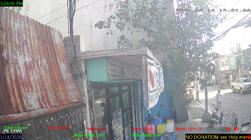 1 Rain season in the Philippines: June 1st to Oct 31st.   5 Estimated amount of water needed to replace the water used by plants and evaporation from the past week. (Negative numbers mean amount of water needed, positive numbers mean excess water is present).   6 Air Quality Index is provided by Luftdaten System esp8266 and is updated every 5 mins..   9 Solar Index represents either an absolute scale of solar energy (W/m²) using the station’s recorded maximum or a percentage of computed theoretical solar maximum using the station’s location and time of day. These indices differ most when the sun is low on the horizon. The current scale is shown, and will toggle if it or the icon is clicked.   10 Historical average only to day 14 of just the month of March for this station since 2016.   11 Historical average rain this season to day 14 of March for this station since 2016.