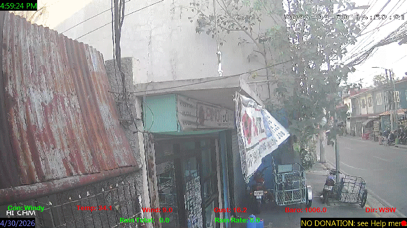 1 Rain season in the Philippines: June 1st to Oct 31st.   5 Estimated amount of water needed to replace the water used by plants and evaporation from the past week. (Negative numbers mean amount of water needed, positive numbers mean excess water is present).   6 Air Quality Index is provided by Luftdaten System esp8266 and is updated every 5 mins..   9 Solar Index represents either an absolute scale of solar energy (W/m²) using the station’s recorded maximum or a percentage of computed theoretical solar maximum using the station’s location and time of day. These indices differ most when the sun is low on the horizon. The current scale is shown, and will toggle if it or the icon is clicked.   10 Historical average only to day 30 of just the month of April for this station since 2017.   11 Historical average rain this season to day 30 of April for this station since 2017.