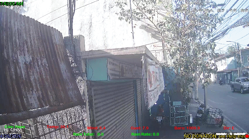 1 Rain season in the Philippines: June 1st to Oct 31st.   5 Estimated amount of water needed to replace the water used by plants and evaporation from the past week. (Negative numbers mean amount of water needed, positive numbers mean excess water is present).   6 Air Quality Index is provided by Luftdaten System esp8266 and is updated every 5 mins..   9 Solar Index represents either an absolute scale of solar energy (W/m²) using the station’s recorded maximum or a percentage of computed theoretical solar maximum using the station’s location and time of day. These indices differ most when the sun is low on the horizon. The current scale is shown, and will toggle if it or the icon is clicked.   10 Historical average only to day 26 of just the month of April for this station since 2017.   11 Historical average rain this season to day 26 of April for this station since 2017.