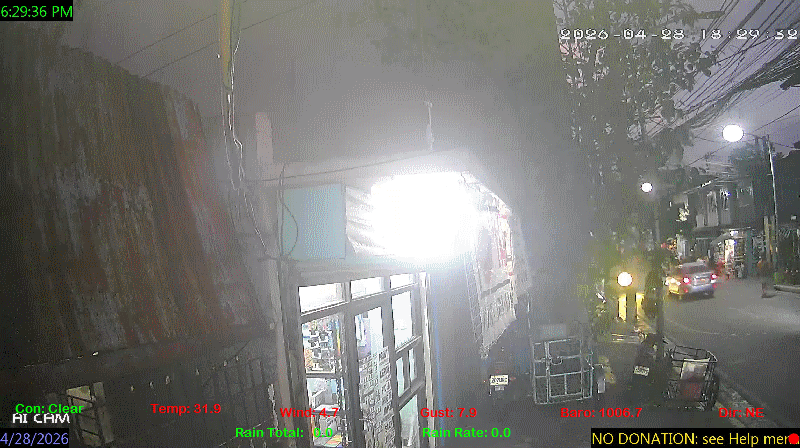 1 Rain season in the Philippines: June 1st to Oct 31st.   5 Estimated amount of water needed to replace the water used by plants and evaporation from the past week. (Negative numbers mean amount of water needed, positive numbers mean excess water is present).   6 Air Quality Index is provided by Luftdaten System esp8266 and is updated every 5 mins..   9 Solar Index represents either an absolute scale of solar energy (W/m²) using the station’s recorded maximum or a percentage of computed theoretical solar maximum using the station’s location and time of day. These indices differ most when the sun is low on the horizon. The current scale is shown, and will toggle if it or the icon is clicked.   10 Historical average only to day 26 of just the month of April for this station since 2017.   11 Historical average rain this season to day 26 of April for this station since 2017.