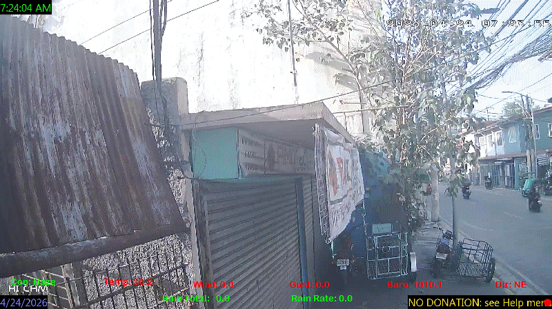 1 Rain season in the Philippines: June 1st to Oct 31st.   5 Estimated amount of water needed to replace the water used by plants and evaporation from the past week. (Negative numbers mean amount of water needed, positive numbers mean excess water is present).   6 Air Quality Index is provided by Luftdaten System esp8266 and is updated every 5 mins..   10 Historical average only to day 24 of just the month of April for this station since 2017.   11 Historical average rain this season to day 24 of April for this station since 2017.