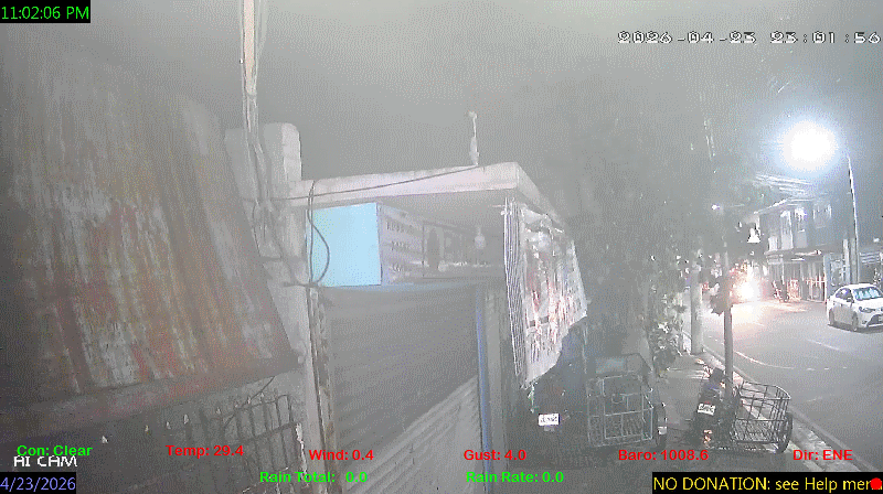 1 Rain season in the Philippines: June 1st to Oct 31st.   5 Estimated amount of water needed to replace the water used by plants and evaporation from the past week. (Negative numbers mean amount of water needed, positive numbers mean excess water is present).   6 Air Quality Index is provided by Luftdaten System esp8266 and is updated every 5 mins..   9 Solar Index represents either an absolute scale of solar energy (W/m²) using the station’s recorded maximum or a percentage of computed theoretical solar maximum using the station’s location and time of day. These indices differ most when the sun is low on the horizon. The current scale is shown, and will toggle if it or the icon is clicked.   10 Historical average only to day 23 of just the month of April for this station since 2017.   11 Historical average rain this season to day 23 of April for this station since 2017.