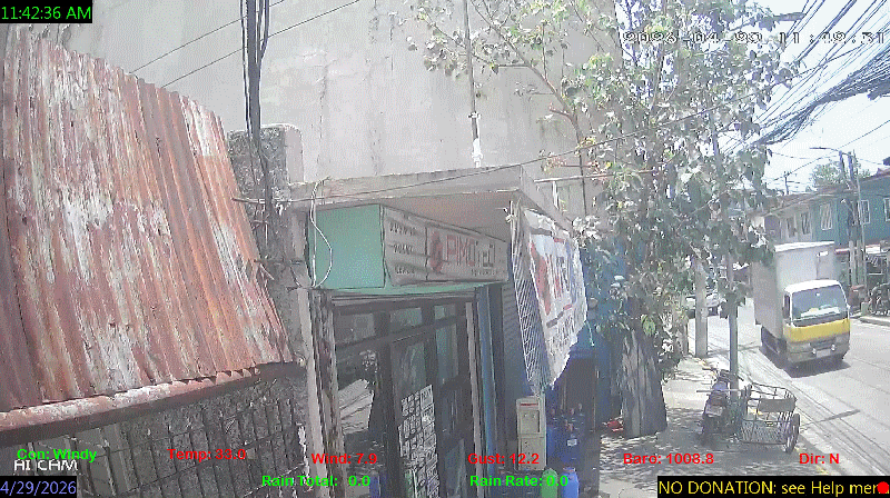 1 Rain season in the Philippines: June 1st to Oct 31st.   5 Estimated amount of water needed to replace the water used by plants and evaporation from the past week. (Negative numbers mean amount of water needed, positive numbers mean excess water is present).   6 Air Quality Index is provided by Luftdaten System esp8266 and is updated every 5 mins..   9 Solar Index represents either an absolute scale of solar energy (W/m²) using the station’s recorded maximum or a percentage of computed theoretical solar maximum using the station’s location and time of day. These indices differ most when the sun is low on the horizon. The current scale is shown, and will toggle if it or the icon is clicked.   10 Historical average only to day 29 of just the month of April for this station since 2017.   11 Historical average rain this season to day 29 of April for this station since 2017.