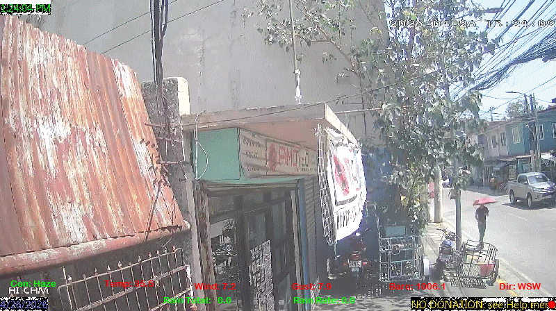 1 Rain season in the Philippines: June 1st to Oct 31st.   5 Estimated amount of water needed to replace the water used by plants and evaporation from the past week. (Negative numbers mean amount of water needed, positive numbers mean excess water is present).   6 Air Quality Index is provided by Luftdaten System esp8266 and is updated every 5 mins..   9 Solar Index represents either an absolute scale of solar energy (W/m²) using the station’s recorded maximum or a percentage of computed theoretical solar maximum using the station’s location and time of day. These indices differ most when the sun is low on the horizon. The current scale is shown, and will toggle if it or the icon is clicked.   10 Historical average only to day 26 of just the month of April for this station since 2017.   11 Historical average rain this season to day 26 of April for this station since 2017.