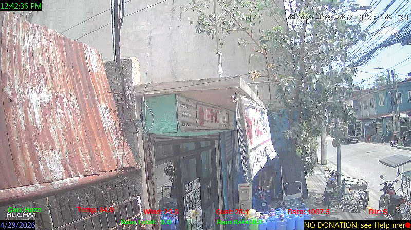 1 Rain season in the Philippines: June 1st to Oct 31st.   5 Estimated amount of water needed to replace the water used by plants and evaporation from the past week. (Negative numbers mean amount of water needed, positive numbers mean excess water is present).   6 Air Quality Index is provided by Luftdaten System esp8266 and is updated every 5 mins..   9 Solar Index represents either an absolute scale of solar energy (W/m²) using the station’s recorded maximum or a percentage of computed theoretical solar maximum using the station’s location and time of day. These indices differ most when the sun is low on the horizon. The current scale is shown, and will toggle if it or the icon is clicked.   10 Historical average only to day 29 of just the month of April for this station since 2017.   11 Historical average rain this season to day 29 of April for this station since 2017.