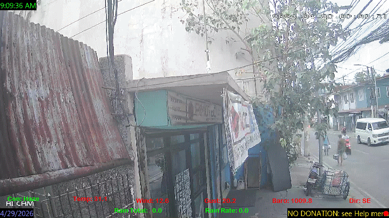 1 Rain season in the Philippines: June 1st to Oct 31st.   5 Estimated amount of water needed to replace the water used by plants and evaporation from the past week. (Negative numbers mean amount of water needed, positive numbers mean excess water is present).   6 Air Quality Index is provided by Luftdaten System esp8266 and is updated every 5 mins..   9 Solar Index represents either an absolute scale of solar energy (W/m²) using the station’s recorded maximum or a percentage of computed theoretical solar maximum using the station’s location and time of day. These indices differ most when the sun is low on the horizon. The current scale is shown, and will toggle if it or the icon is clicked.   10 Historical average only to day 29 of just the month of April for this station since 2017.   11 Historical average rain this season to day 29 of April for this station since 2017.