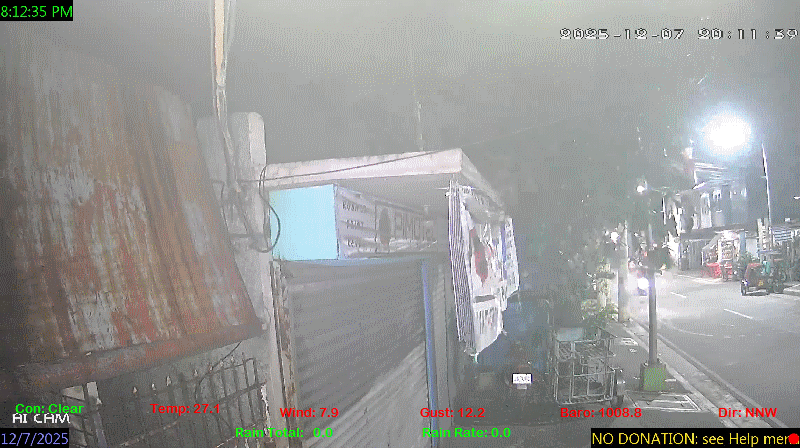 1 Rain season in the Philippines: June 1st to Oct 31st.   5 Estimated amount of water needed to replace the water used by plants and evaporation from the past week. (Negative numbers mean amount of water needed, positive numbers mean excess water is present).   6 Air Quality Index is provided by Luftdaten System esp8266 and is updated every 5 mins..   9 Solar Index represents either an absolute scale of solar energy (W/m²) using the station’s recorded maximum or a percentage of computed theoretical solar maximum using the station’s location and time of day. These indices differ most when the sun is low on the horizon. The current scale is shown, and will toggle if it or the icon is clicked.   10 Historical average only to day 7 of just the month of December for this station since 2016.   11 Historical average rain this season to day 7 of December for this station since 2016.